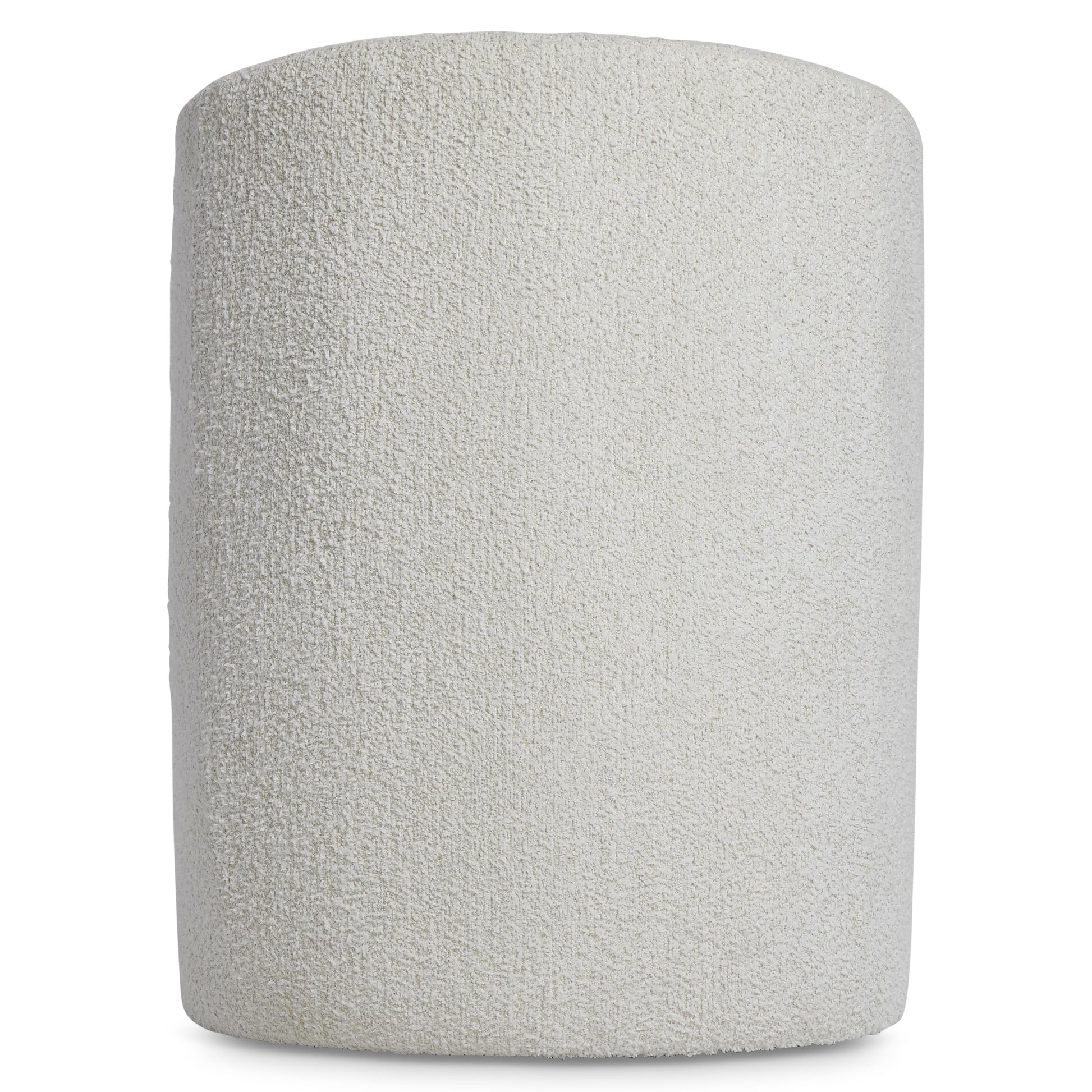 The Arcadia upholstered arm chair features an embracing back that curves around the seat for a sculptural look. The deep seat flows to the floor, and hidden casters offer smooth movement. A textural fabric adds visual impact to the neutral palette