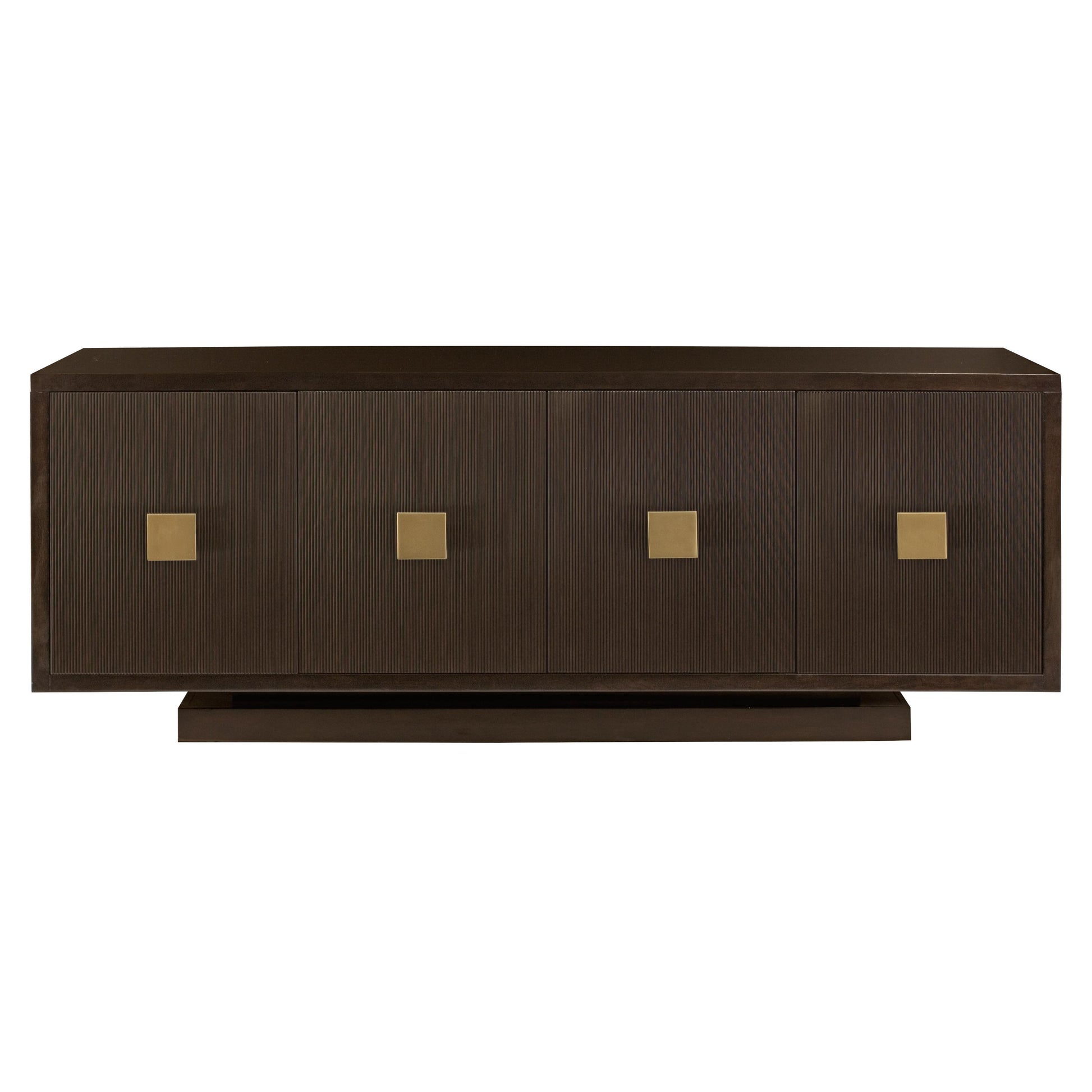 Bernhardt Interiors offers high-design furniture with an eclectic edge. Crafted from flat-cut walnut veneers in an ebonized finish, the Boulevard buffet has an architectural structure inspired by mid-century modern design. The beaded door fronts feature elegant square pulls with a brassy sheen. This handsome buffet offers the ultimate compromise between simplicity and luxury.