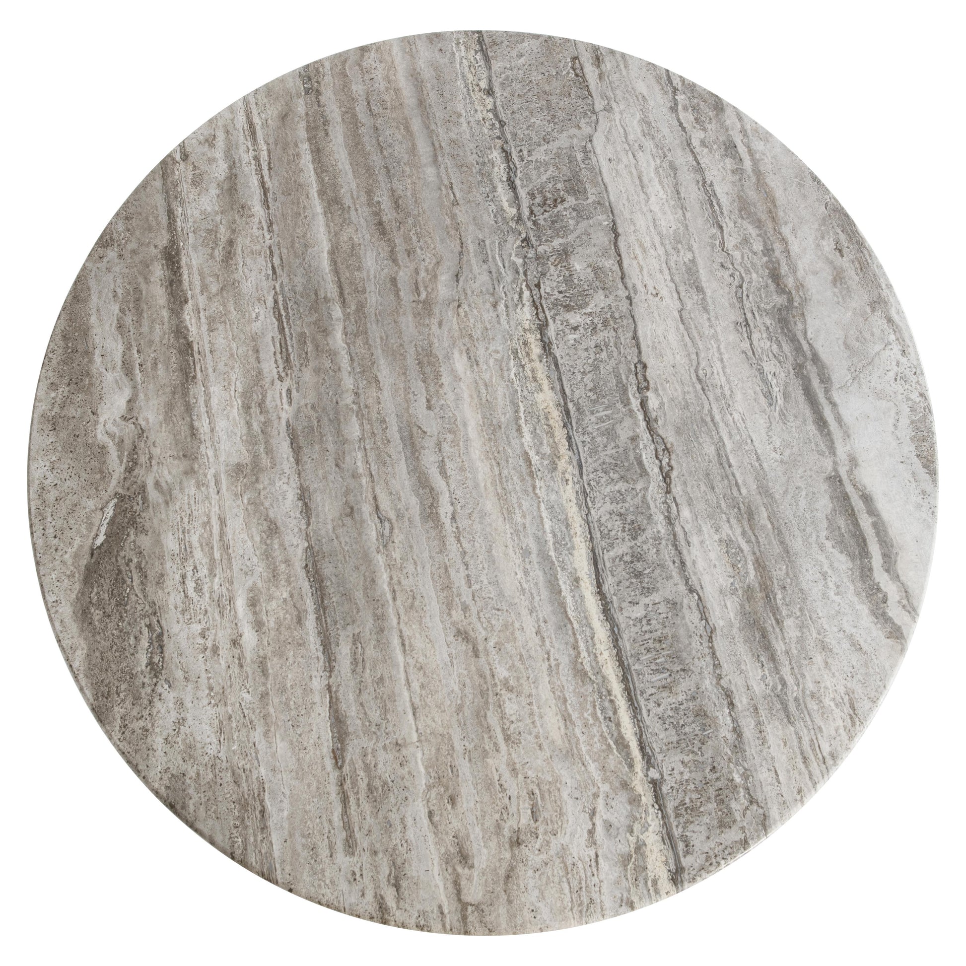Intersecting and angled metal planes offer a modern architectural style for the Equis dining table. Featuring a Graphite finish over steel, the panels are attached to a square steel floor base. The stunning top of honed silver travertine stone adds an organic beauty to the design